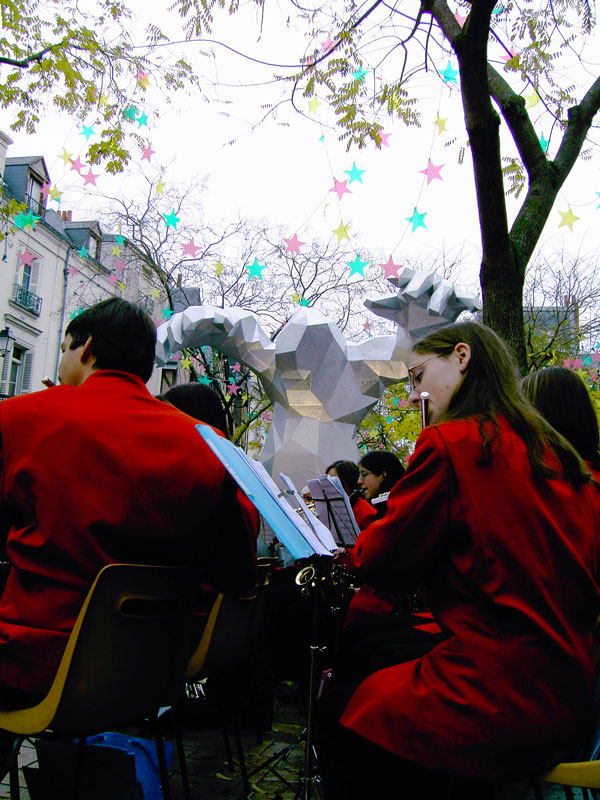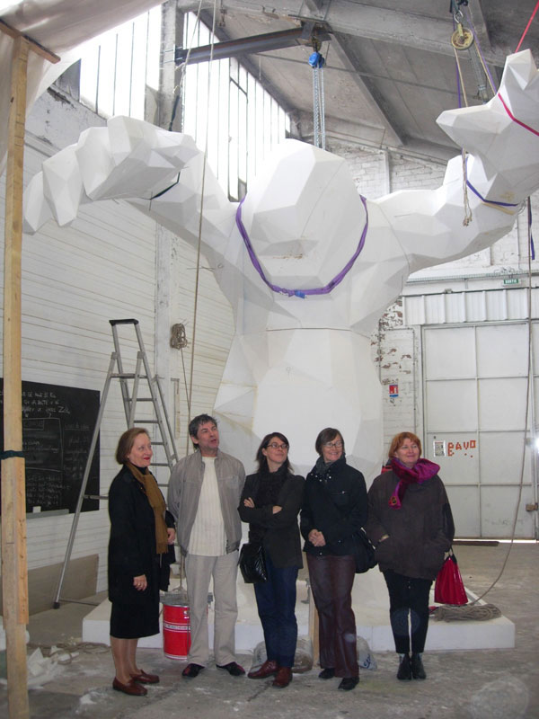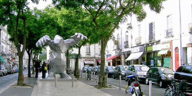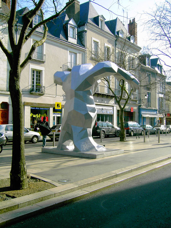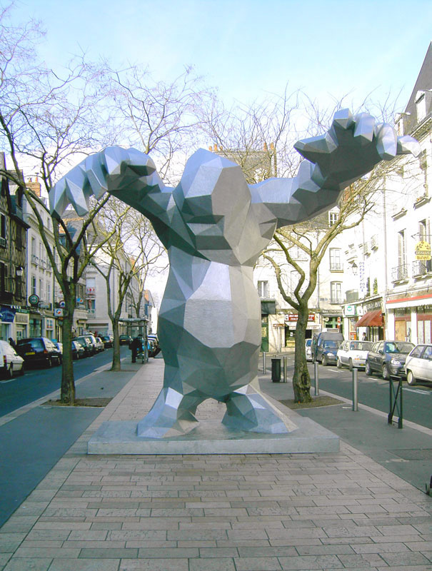 L’artiste Xavier Veilhan conçoit Le Monstre, une sculpture monumentale représentant une figure fantastique, à la fois familière et énigmatique. Inspirée des emblèmes héraldiques, l’œuvre joue sur l’ambivalence — protectrice et inquiétante — et invite à la projection imaginaire. Par un langage formel réduit à l’essentiel — une forme simple, une couleur vive, une surface lisse — elle s’impose comme un signal fort dans l’espace public, transformant la place en point de repère et en lieu d’appropriation collective.