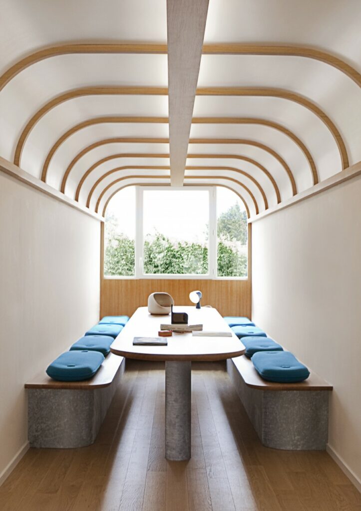 La designer Ionna Vautrin crée l’œuvre Péniche, en transformant le 101ème logement en lieu de convivialité esthétique et fonctionnel. En lien avec l’architecture et la localisation de la résidence, elle s’est inspirée du monde maritime et du paysage industriel pour créer un espace épuré aux formes enveloppantes.