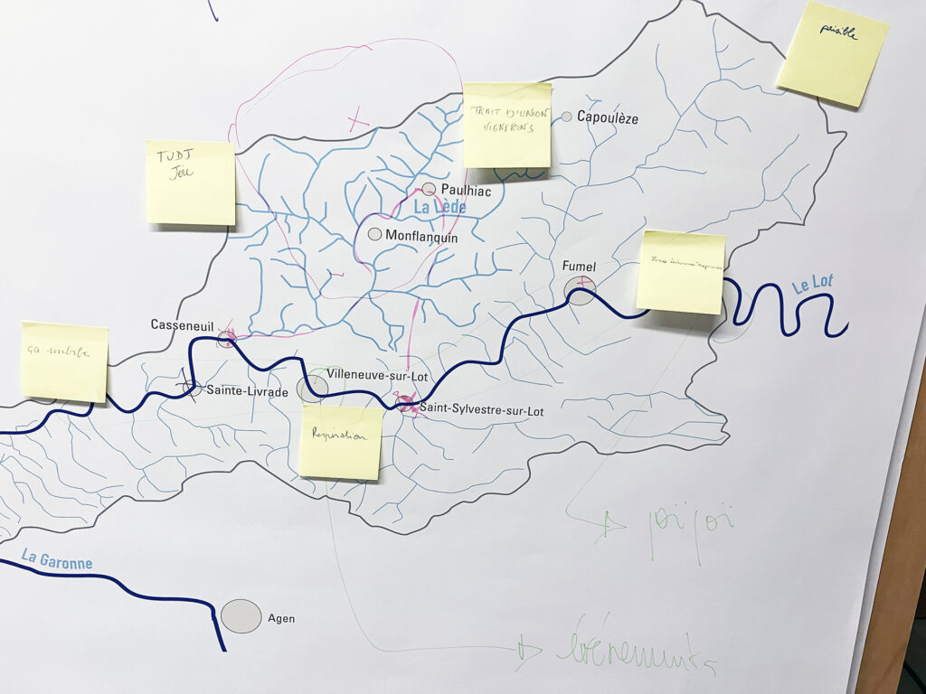 Situé dans la vallée du Lot, rivière qui relie cinq départements (Lozère, Aveyron, Cantal, Lot et Lot-et-Garonne) et trois régions (Occitanie, Nouvelle Aquitaine, Auvergne-Rhône-Alpes), la commande s’inscrit dans une réflexion et des actions menées, depuis plusieurs mois par des habitant·es de cette vallée, qui considèrent que la rivière ne peut être réduite à une seule ressource, qu’elle doit être envisagée comme une entité vivante avec laquelle pourraient s’engager de nouvelles alliances.