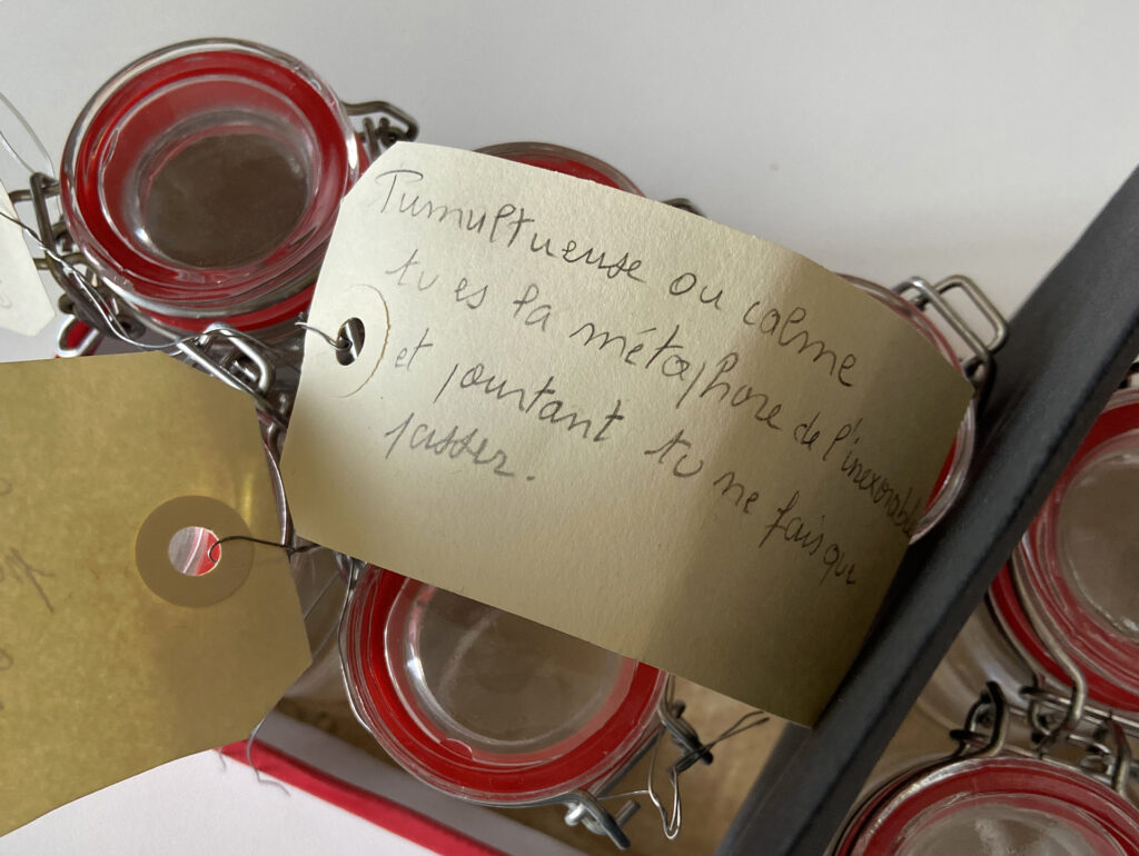 Petites fioles contenant de l’eau du Lot et étiquetées de messages personnels sur la rivière offertes par les commanditaires à Laure Subreville, octobre 2025