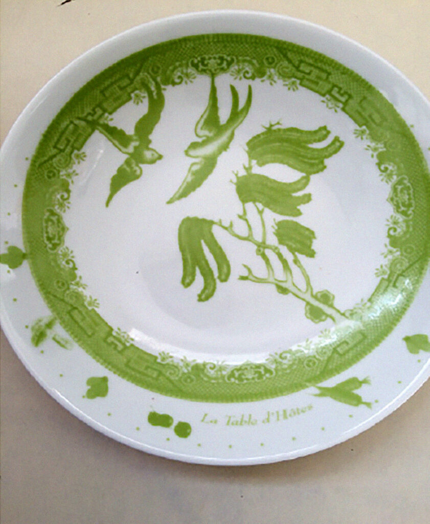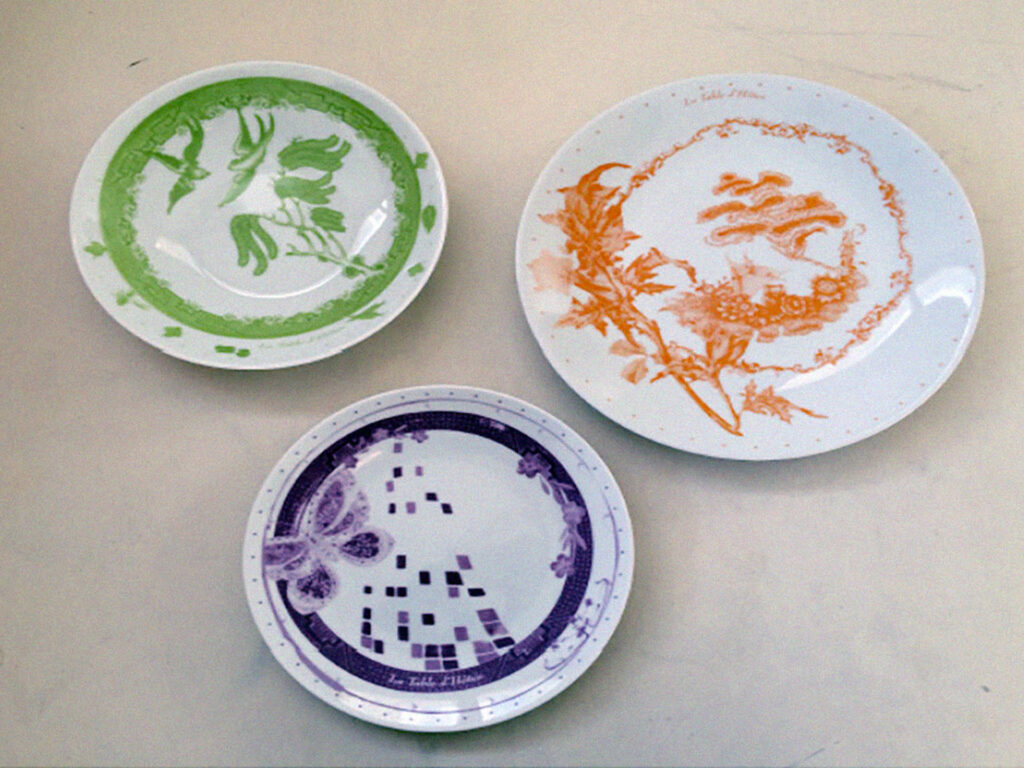 2. La production d’une série d’assiettes pour la Table d’hôtes à partir d’anciennes collections mises au rebut et réimprimées de motifs créés tout spécialement pour l’occasion par dessus les anciens motifs. Cette collection de vaisselle est destinée à être utilisée à chaque repas servi, ajoutant une notion d’identité, d’appartenance et de valeur ajoutée à cette expérience collective.