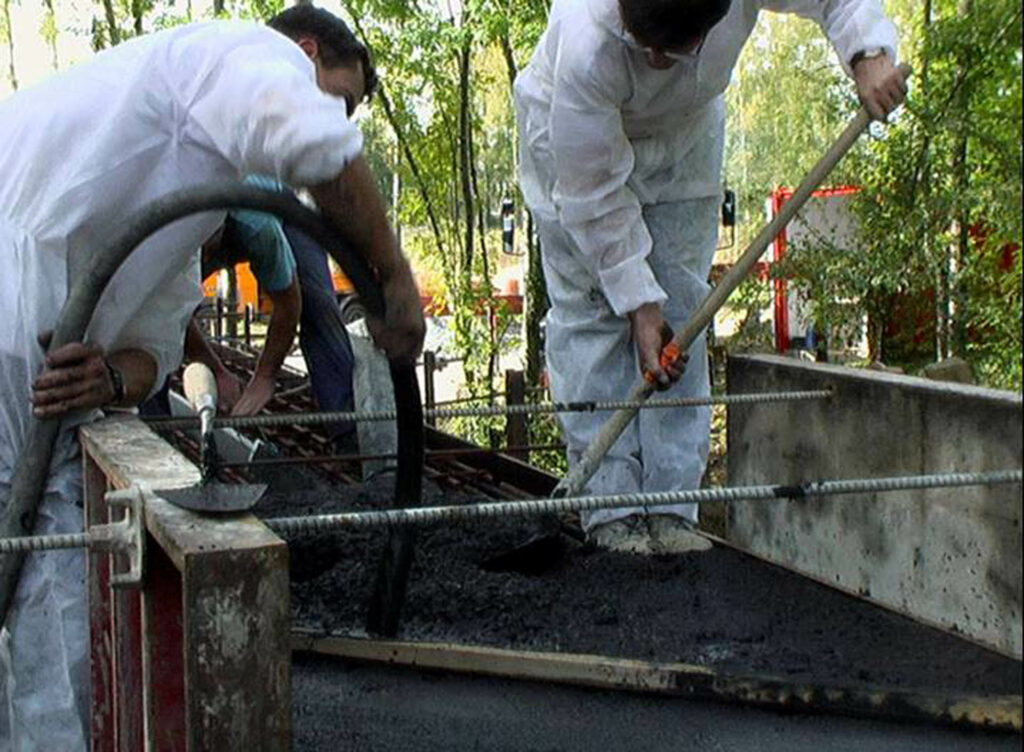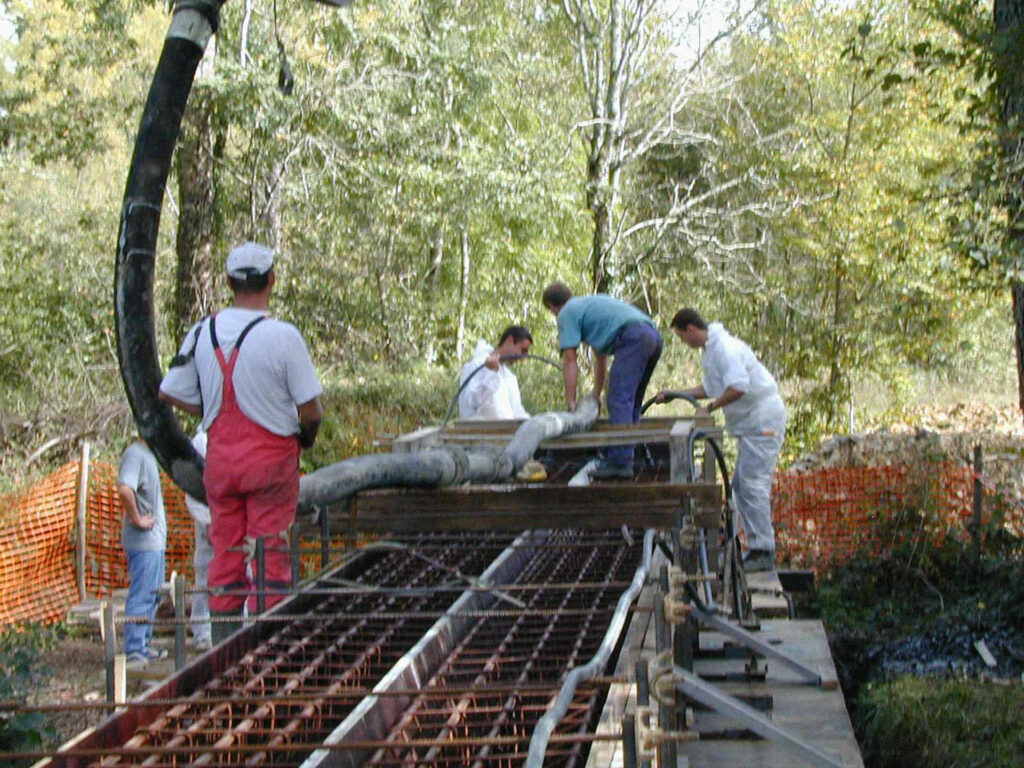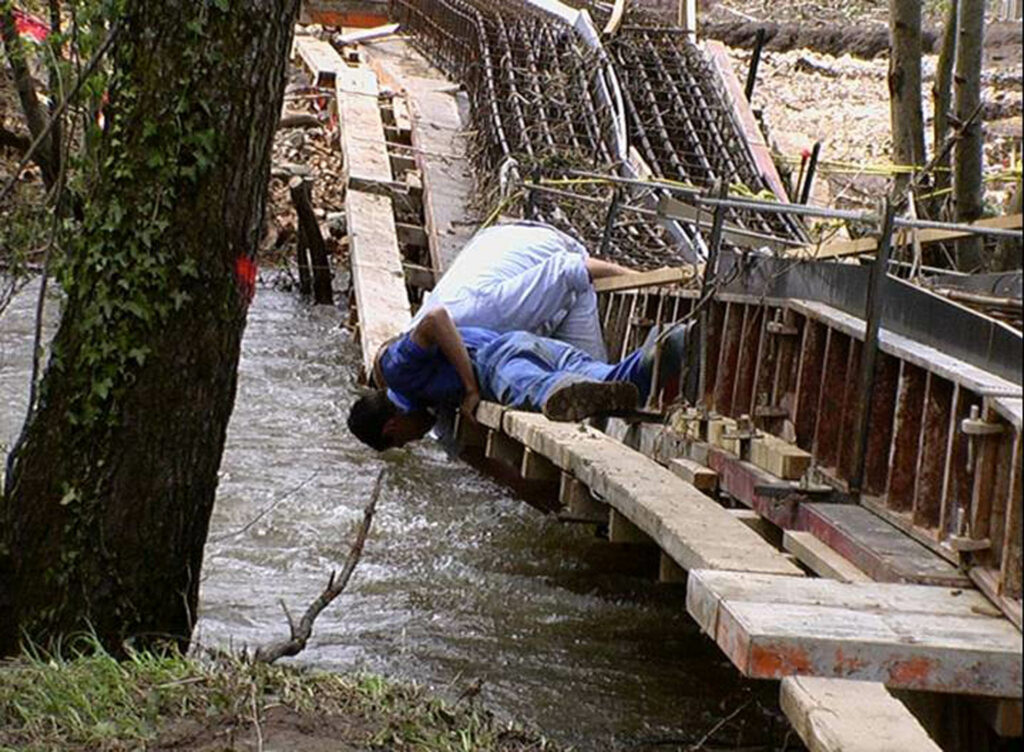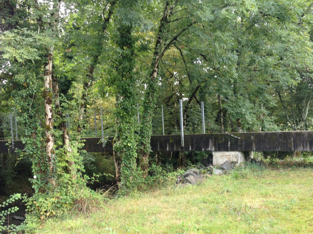 C’est l’artiste Pierre Lafon qui est choisi pour répondre à cette commande. D’un dessin minimal et sobre, affirmant une franche linéarité tout en présentant un caractère massif, la passerelle pensée par l’artiste se compose de deux poutres de béton juxtaposées mais très légèrement espacées. Ce vide permet aux passant·es de regarder l’eau s’écouler, donnant l’impression d’une légèreté contrastant avec la rusticité de la pierre de Baysse. L’artiste précise : « Le dessous des poutres, non-visible, forme un V tourné vers la rivière qui agit tel « un œil » et constitue un capteur et un réflecteur pour la lumière de l’eau projetée en direction du passant à travers « le jeu et la tolérance » entre les blocs. La focale varie en fonction de la hauteur de l’eau et établit pour l’ouvrage un échange avec la rivière. »