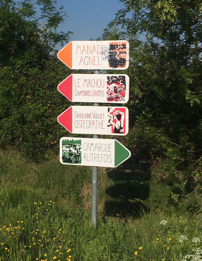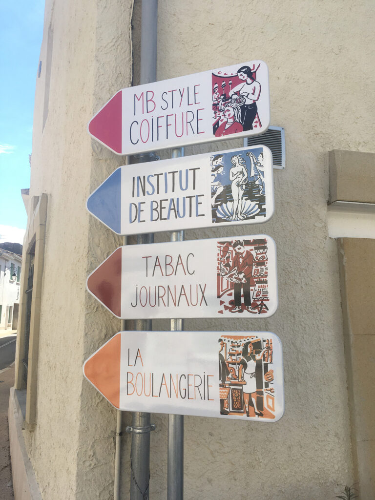 François Boisrond, La signalétique du Cailar, 1996, réhabilitation 2020, des panneaux signalétiques à l’intérieur du village, Le Cailar (Gard) © Jean-Marie Bénézet