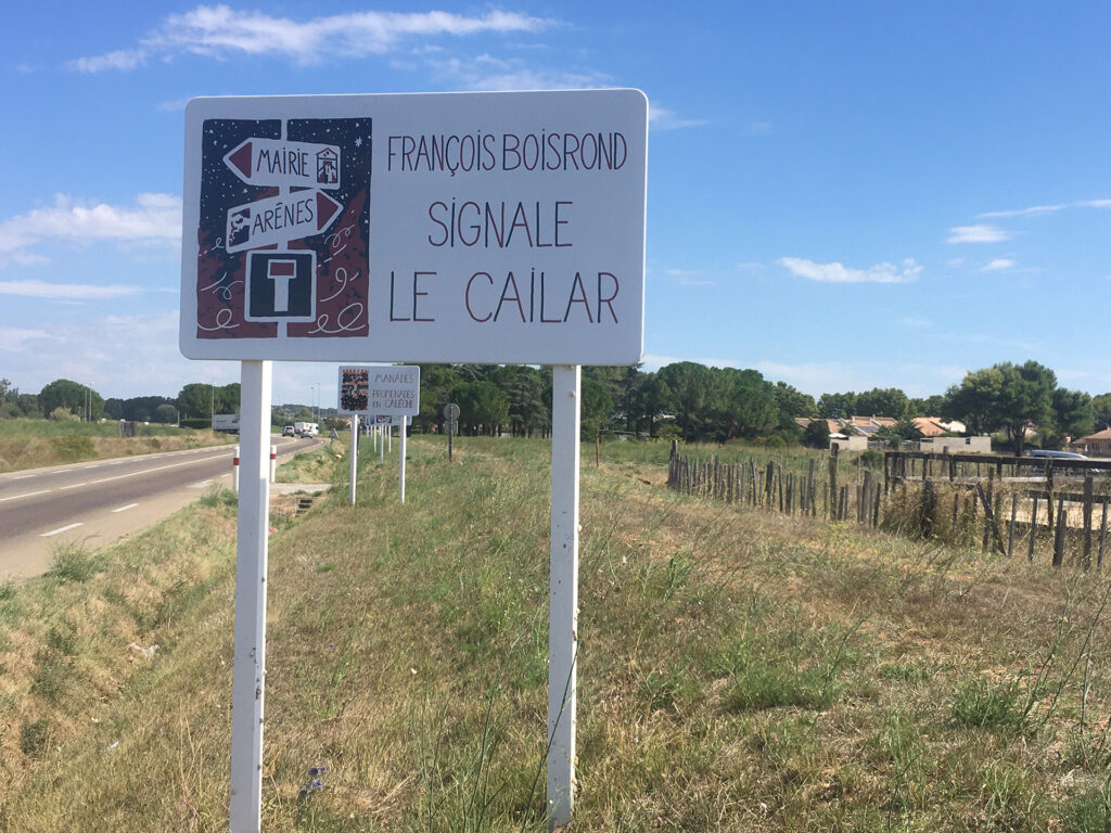 Au Cailar, dans le Gard, des commerçants et artisans souhaitent, en 1993, repenser la signalétique du village en la confiant à un artiste.