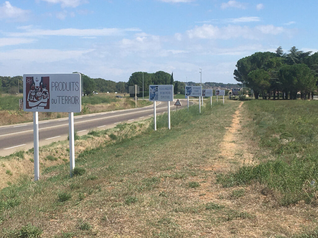François Boisrond, La signalétique du Cailar, 1996, réhabilitation 2020, des panneaux signalétiques à l’extérieur du village, Le Cailar (Gard) © Jean-Marie Bénézet