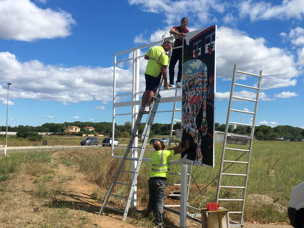 Montage du grand panneau à l’entrée du village en 2020 © Jean-Marie Bénézet