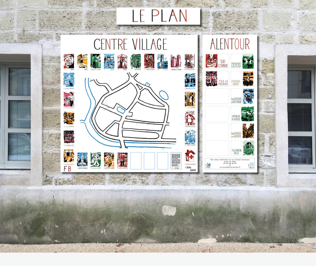 Le groupe de commanditaires, composé de commerçants, d’artisans et d’élus, formule une demande à la fois pratique et symbolique : concevoir un ensemble d’enseignes cohérent, capable d’identifier les commerces et les services tout en participant à une image commune du territoire. La commande porte sur différents types de supports — enseignes de boutiques, pré-enseignes et panneaux d’entrée de ville — et implique une diffusion à l’échelle de l’ensemble du village.