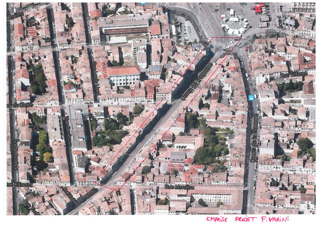 En faisant appel à l’artiste Felice Varini, les commanditaires souhaitent arrêter le mouvement du cours de l’Argonne en le décomposant, le fragmentant. Que l’œuvre puisse inviter passantes et passants, habitantes et habitants, visiteuses et visiteurs à s’arrêter sur le cours, à le regarder d’un point de vue précis, celui de la Place de la Victoire. C’est depuis ce point qu’il est prévu qu’Arc de ciel, arc de terre – une peinture monumentale se déployant sur les murs, les sols et les toits du cours de l’Argonne – soit visible. L’artiste dit : « L’espace architectural, et tout ce qui le constitue, est mon terrain d’action. J’interviens in-situ dans un lieu chaque fois différent et mon travail évolue en relation aux espaces que je suis amené à rencontrer. En général, je parcours le lieu en relevant son architecture, ses matériaux, son histoire et sa fonction. À partir de ses différentes données spatiales, je définis un point de vue autour duquel mon intervention prend forme. »